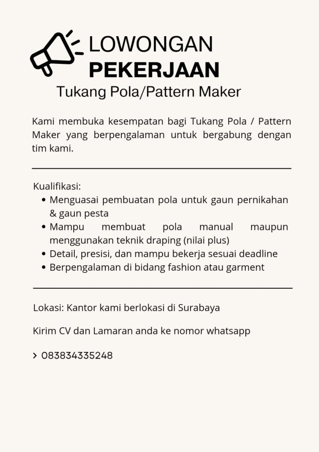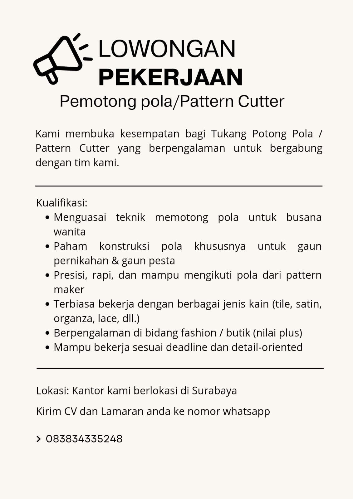 Dicari penjahit, tukang pola dan pemotongan pola segera