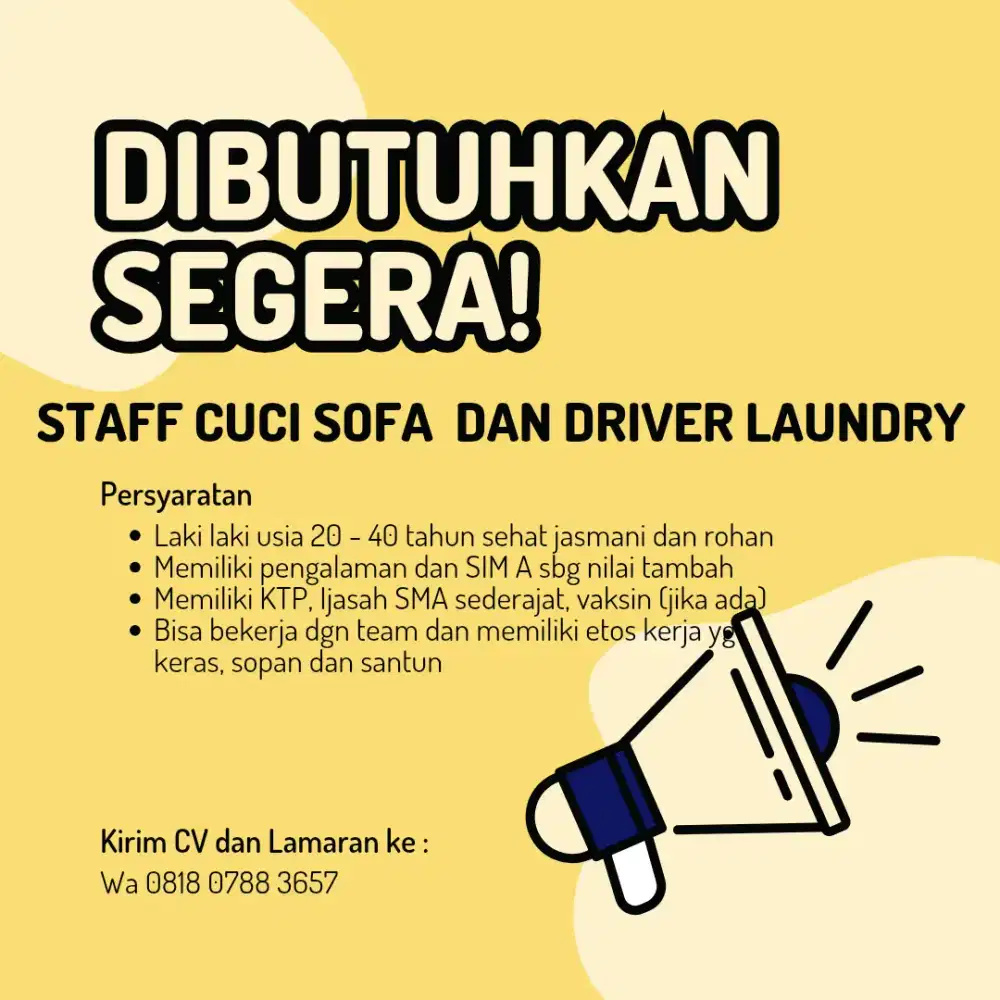 Dicari segera staff : Staff Cuci Sofa, Karpet, Stroller dll dgn syarat sbb: Pria max 40 tahun sehat jasmani rohani, punya pengalaman cuci sofa atau di laundry min 6 bulan Bekerja Shift 1 : 08.00 - 19.00 Libur 1 minggu sekali Jujur, Rajin, serius kerja, loyal, Sopan dan bs bekerja team Rumah daerah Pamulang, Ciater BSD (tidak menyediakan mess) Memiliki motor pribadi, KTP, Ijazah SMA, atau sederajat Terdapat tambahan uang kehadiran 10.000 perhari Terdapat bonus jika membantu menyelesaikan pekerjaan lain. Pendapatan bisa LEBIH BESAR semua tergantung kinerja staff itu sendiri. Jika memenuhi persyaratan segera WA dan isi data diri : Nama : Jenis klamin : Usia : Alamat Rumah: Status pernikahan : Pendidikan terakhir: Pekerjaan sekarang : Pengalaman : Terakhir kerja : Alasan berhenti Persyaratan dokumentasi : Motor pribadi (mempermudah mobilisasi) Ktp Foto ijazah SMK/SMA Dokumen dpt dilengkapi via wa