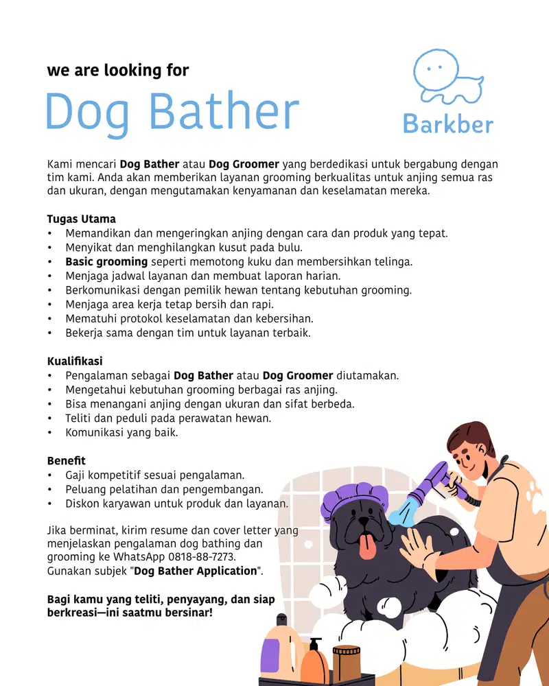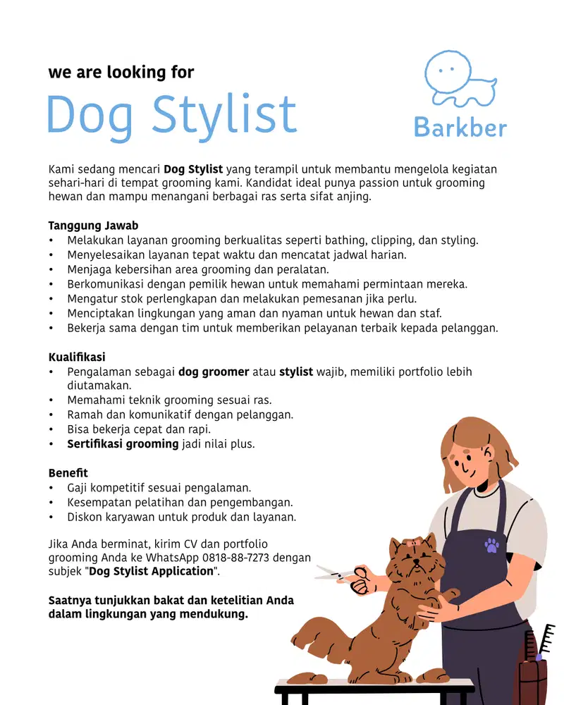 IKLAN AKTIF = LOKER TERSEDIA BUDAYAKAN MEMBACA IKLAN DAHULU (slide gambar) Dibutuhkan tenaga professional dan berpengalaman 2 Dog Stylist (berpengalaman), gaji 4-8jt, tergantung skill dan pengalaman grooming 3 Dog Groomer/ Bather, gaji 2.8-4jt, tergantung skill dan pengalaman grooming Silahkan kirim CV dan cantumkan posisi yang dilamar ke WA (nomor tertera)