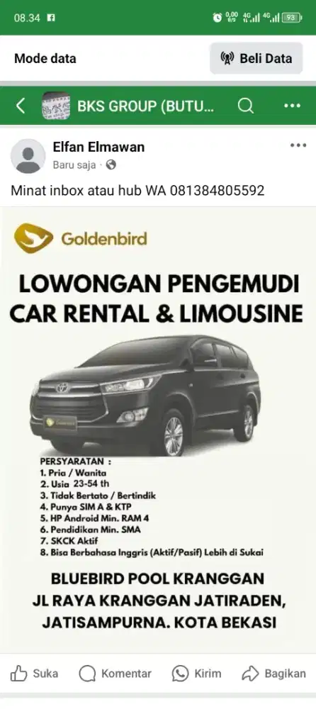 Persyaratan: 1. usia 23-55 Tahun 2. memiliki sim a aktif 3. hp android minimal ram 3gb 4. tdk bertatto/tindik 5. memiliki ktp 6. memiliki minimal ijazah SD Benefit: -bonus harian dan bulanan -tersedia mess kapasitas besar -tunjangan pensiun -fasilitas kesehatan -beasiswa anak Lokasi: Jl. Raya Kranggan, RT.003/RW.006, Jatiraden, Kec. Jatisampurna, Kota Bks, Jawa Barat 17432