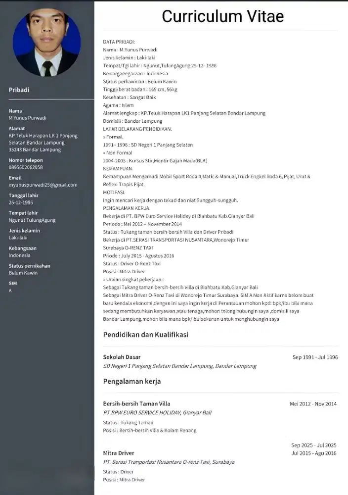 Status : Tukang taman bersih-bersih Villa dan Driver Pribadi