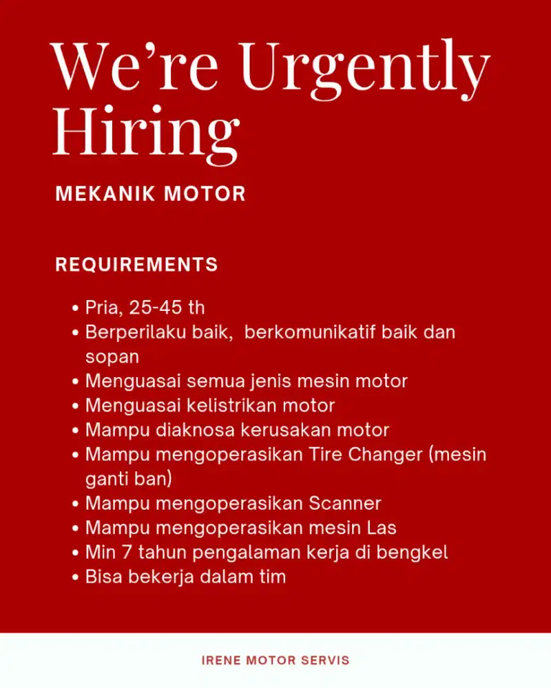 Dibutuhkan segera Mekanik Motor Profesional dan Berpengalaman Lokasi bengkel karawaci, Tangerang. Kriteria: - Pria, 25-45 th - Berperilaku baik, berkomunikatif baik dan sopan - Menguasai semua jenis mesin motor - Menguasai kelistrikan motor - Mampu diaknosa kerusakan motor - Mampu mengoperasikan Tire Changer (mesin ganti ban) - Mampu mengoperasikan Scanner - Mampu mengoperasikan mesin Las - Min 7 tahun pengalaman kerja di bengkel - Bisa bekerja dalam tim Mohon baca kriteria di atas sebelum melamar. Terimakasih.