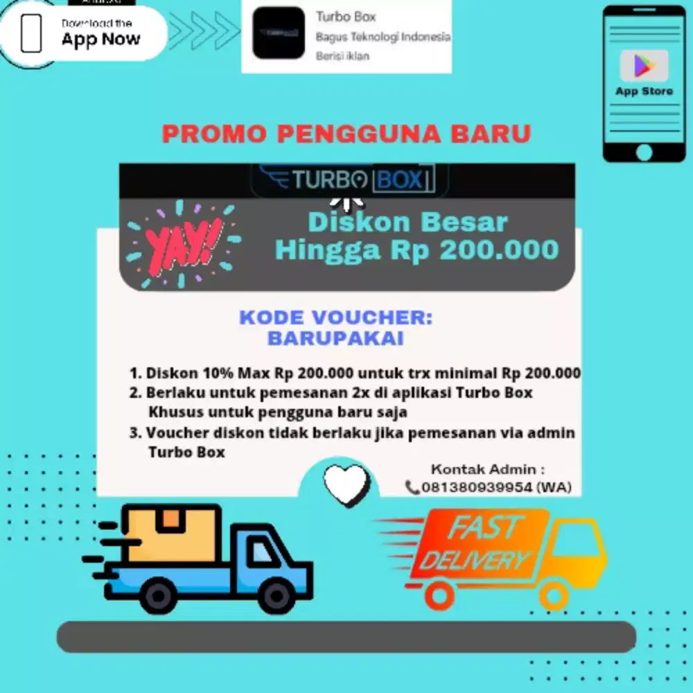 Masukkan kode voucher diskon : BARUPAKAI saat pemesanan di aplikasi Turbo Box agar dapat potongan harga 10% hingga 200rb (Khusus untuk pengguna baru dan kode voucher bisa digunakan untuk 2x pemesanan ) atau