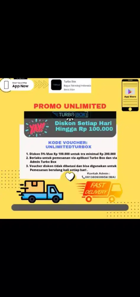 Masukkan kode voucher diskon : BARUPAKAI saat pemesanan di aplikasi Turbo Box agar dapat potongan harga 10% hingga 200rb (Khusus untuk pengguna baru dan kode voucher bisa digunakan untuk 2x pemesanan ) atau