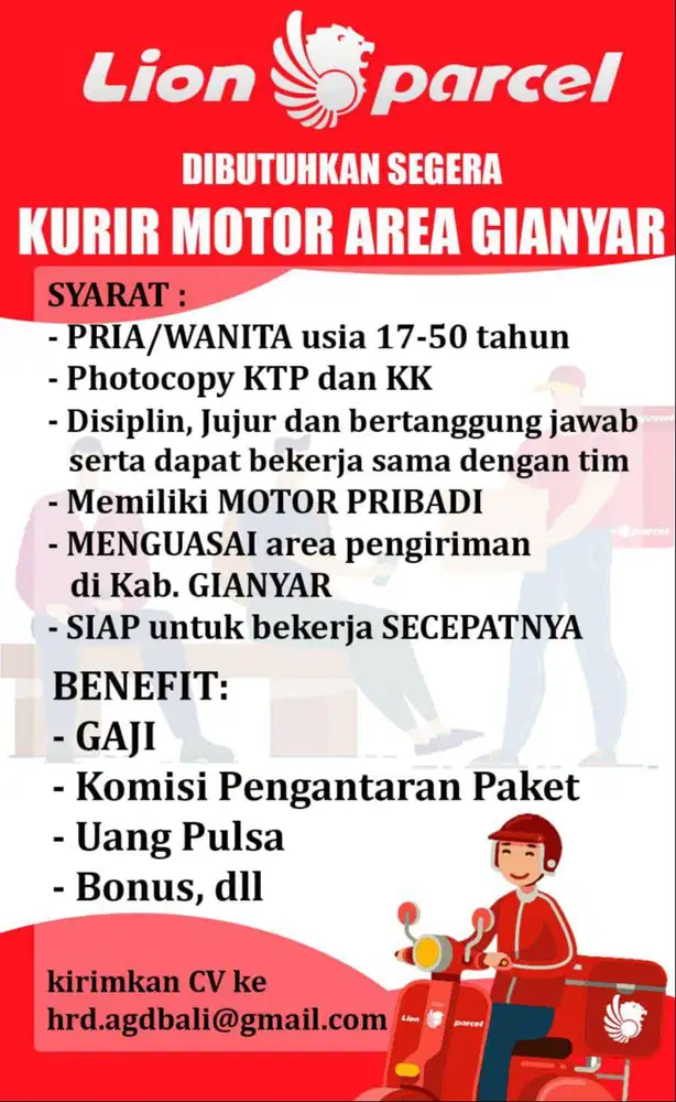 DIBUTUHKAN SEGERA KURIR LION PARCEL GIANYAR SYARAT DAN KETENTUAN 1. SIM C AKTIF 2. MEMILIKI KENDARAAN PRIBADI & HP ANDROID BENEFIT 1. GAJI 2. BONUS PENGIRIMAN 3. UANG PULSA 4. BONUS LAIN-LAIN SEGERA DIKIRIM LAMARAN KALIAN