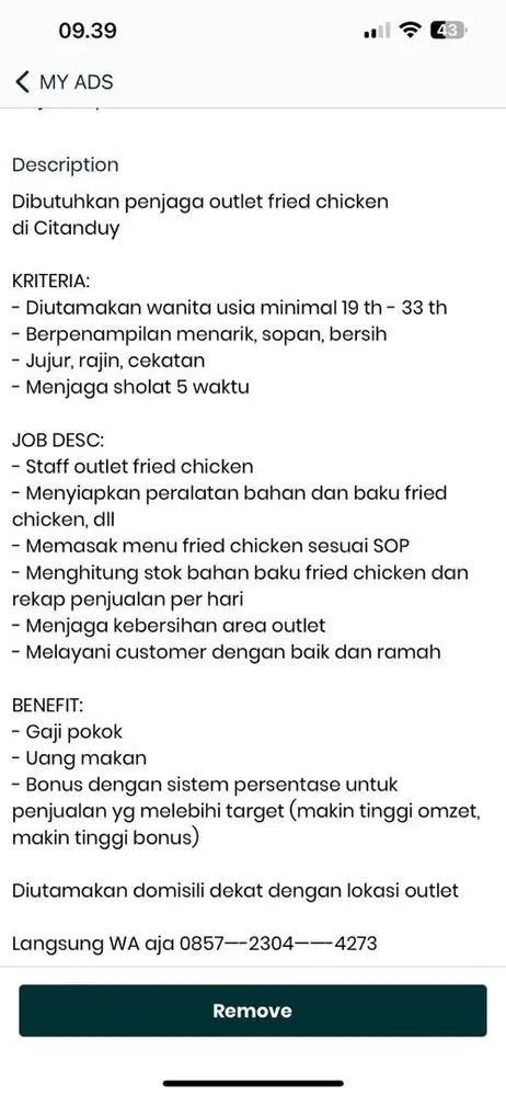 Dibutuhkan penjaga outlet fried chicken di Citanduy-Ciputat. KRITERIA: - Diutamakan wanita usia minimal 20 th - 33 th - Berpenampilan menarik, sopan, bersih - Jujur, rajin, cekatan - Menjaga sholat 5 waktu JOB DESC: - Staff outlet fried chicken - Menyiapkan peralatan bahan dan baku fried chicken, dll - Memasak menu fried chicken sesuai SOP - Menghitung stok bahan baku fried chicken dan rekap penjualan per hari - Menjaga kebersihan area outlet - Melayani customer dengan baik dan ramah BENEFIT: - Gaji pokok - Uang makan - Bonus dengan sistem persentase untuk penjualan yg melebihi target (makin tinggi omzet, makin tinggi bonus) Diutamakan domisili dekat dengan lokasi outlet Citanduy-Ciputat