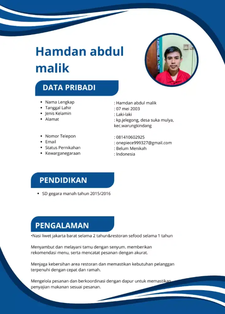 Saudara/i kita yang bernama "OLX User" yang beralamat di "Gekbrong Cianjur Kab." sedang membutuhkan pekerjaan.