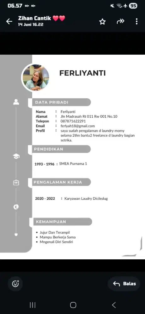 Saudara/i kita yang bernama "Lia" yang beralamat di "Pancoran Jakarta Selatan" sedang membutuhkan pekerjaan.