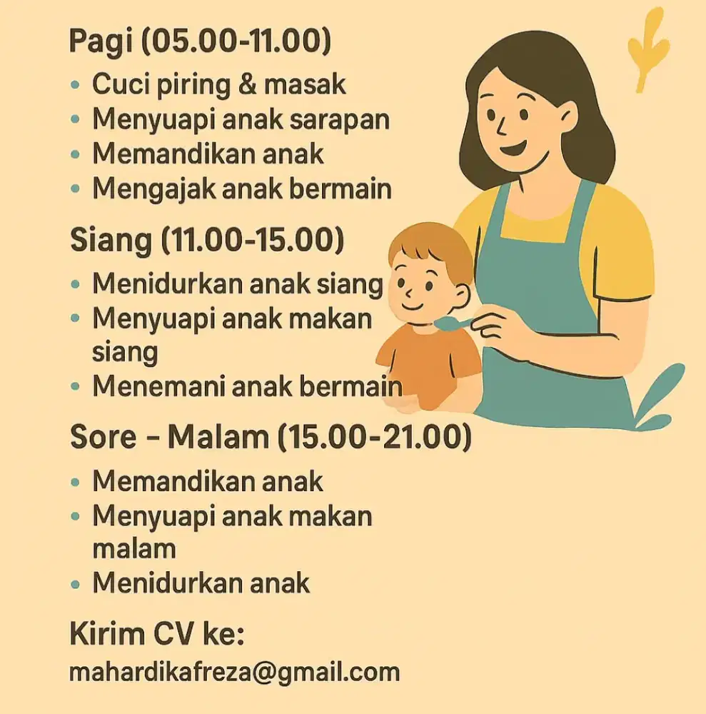 Lowongan Pekerjaan Baby Sitter merangkap ART ringan (MENGINAP). Persyaratan : - Bisa mengasuh dan mengurus anak (toddler) - Penyayang dan Penyabar. - Senang mengajak anak bermain dan belajar. - Bisa masak dan mengurus rumah. - Bisa mencuci dan menyetrika pakaian. Gambaran job desk dapan dilihat pada foto. Kirim CV dan data lengkap ke email yang tertera di foto. Atau chat WA ke nomor tertera.