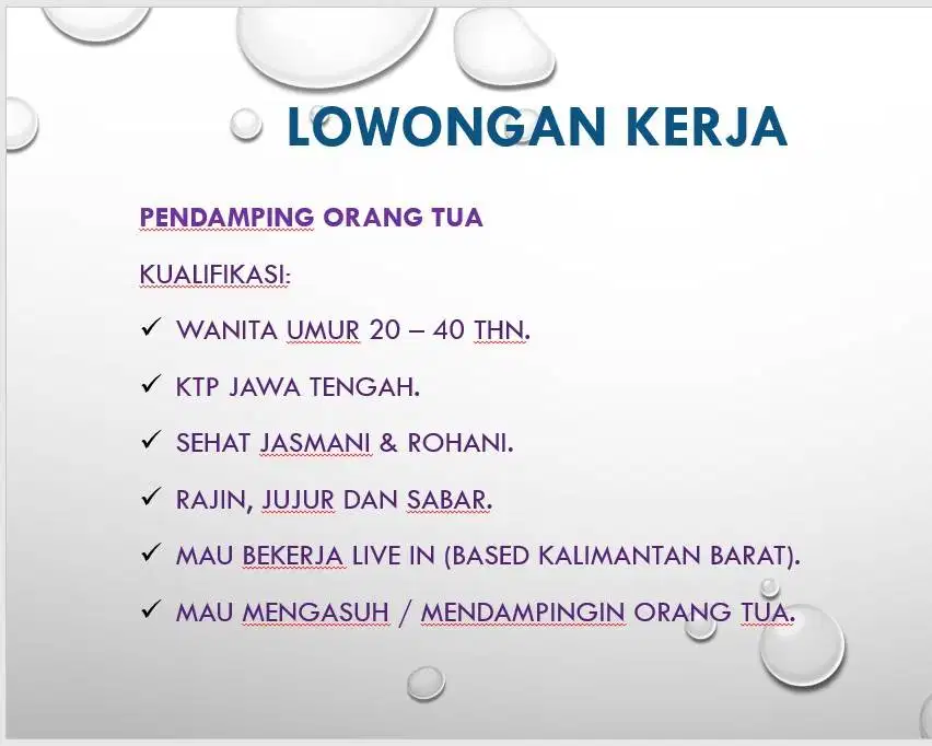 Lowongan untuk Pendamping Orang Tua. Kualifikasi: * Wanita umur 20 – 40 Thn. * KTP Jawa Tengah. * Sehat jasmani & Rohani. * Rajin, jujur dan sabar. * Mau bekerja live in (Based Kalimantan barat). * mau mengasuh / mendampingin orang tua. Benefit: * Gaji 3 - 4 jt tergantung pengalaman. * Kontrak 1 thn.