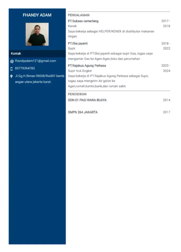 Saudara/i kita yang bernama "Fhandy adam" yang beralamat di "Kembangan Jakarta Barat" sedang membutuhkan pekerjaan.