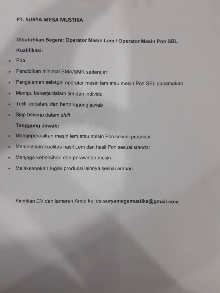 Posisi Tersedia LOWONGAN KERJA OPERATOR MESIN LEM DAN OPERATOR MESIN SBL – Hubungi Sekarang