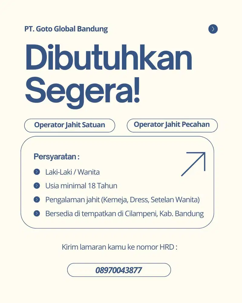 Bertugas menjahit pecahan maupun sample produk garmen seperti kemeja, setelan, dan dress wanita sesuai standar kualitas. Diutamakan berpengalaman menggunakan berbagai jenis mesin jahit dan mampu bekerja rapi serta tepat waktu.