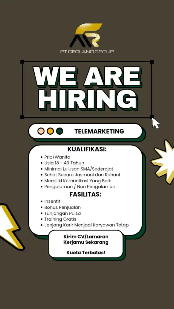 Dibutuhkan Segera: Telemarketing ​PT Geoland Group membuka kesempatan bagi Anda yang ingin berkarir dan berkembang bersama kami. Kami mencari individu yang bersemangat dan komunikatif untuk bergabung dengan tim kami. ​Terbuka untuk yang sudah berpengalaman maupun yang baru lulus (fresh graduate)! ​Kualifikasi: - ​Pria / Wanita - ​Usia 18 - 40 tahun - ​Pendidikan minimal SMA / Sederajat - ​Sehat secara jasmani dan rohani - ​Memiliki kemampuan komunikasi yang baik dan percaya diri - ​Pengalaman (Non Pengalaman dipersilakan) ​Fasilitas yang Anda Dapatkan: - ​Insentif yang menarik - ​Bonus dari penjualan - ​Tunjangan Pulsa - ​Training GRATIS sampai bisa - ​Jenjang karir menjadi Karyawan Tetap ​Cara Melamar: Jika Anda memenuhi kualifikasi di atas, segera kirimkan CV dan Surat Lamaran Kerja Anda ke DM ​Dengan subjek: Lamaran Telemarketing - [Nama Anda] ​Kuota terbatas! Jangan lewatkan kesempatan ini untuk bergabung dengan tim yang solid dan profesional. Kirim lamaran Anda sekarang juga! ​Lokasi Kantor: Daerah Sepatan