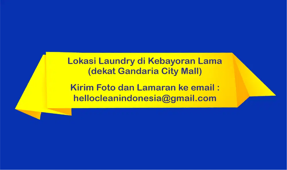 Lowongan kerja LAUNDRY di Kebayoran Lama (dekat Gandaria City Mall). Syarat : - Pria/Wanita, max usia 30 th - Pendidikan minimal lulus SMP - Bawa motor sendiri (ada uang bensin) Fasilitas : - Gaji bulanan - Uang Makan - Bonus Bulanan - Libur Mingguan - BPJS Kesehatan Kirim Foto dan lamaran anda ke email yang tertera di foto iklan ini Keterangan : - Tidak harus punya pengalaman kerja sebelumnya. - Tidak tersedia mess.
