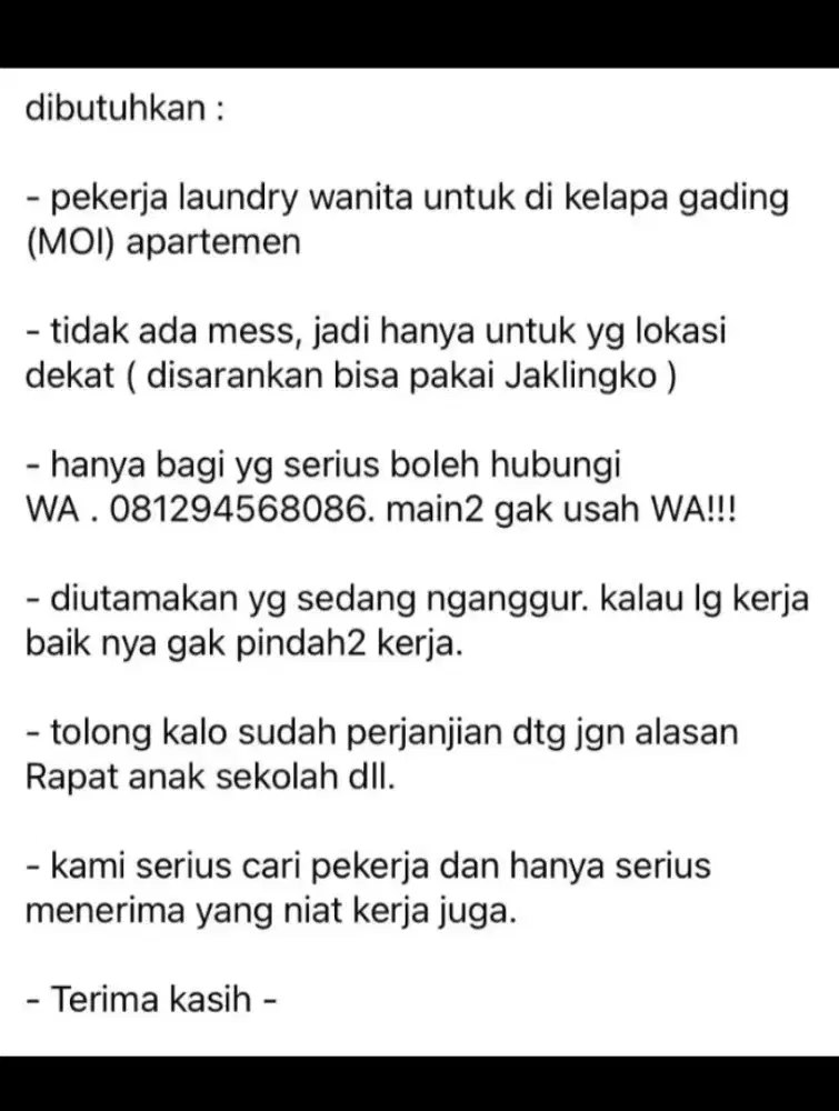 Lowongan Kerja Hari Ini Laundry Apartemen Moi – Hubungi segera