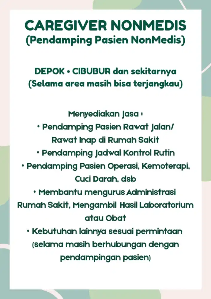 Bagi yang membutuhkan Jasa Caregiver Non-Medis (Pendamping Pasien) harian untuk Wilayah Depok, Cibubur dan sekitarnya. Jasa Pendampingan Pasien : • Membantu mendampingi pasien Rawat Jalan atau Rawat Inap di RS • Mendampingi Jadwal Kontrol Rutin Pasien • Mendampingi Pasien Operasi, Kemoterapi, Cuci Darah, dsb • Membantu mengurus Administrasi, mengambil hasil laboratorium atau obat. • Kebutuhan pasien lainnya selama masih berhubungan dengan pendampingan pasien. Jadwal Pendampingan : Hari Senin - Sabtu Mulai Jam 07.00 (sesuai request)