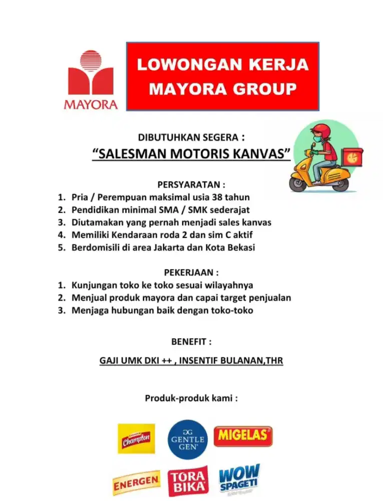 Lokasi penempatan : Jakarta timur , jakarta pusat , jakarta Utara Posisi : sales canvas , sales TO Reguler Status kerja : full time Cara melamar : Datang langsung Lowongan tidak di pungut biaya apapun Hanya pelamar yang memenuhi kualifikasi yang akan di lanjut ke tahap berikutnya Hati hati penipuan mengatasi namakan pt mayora grup
