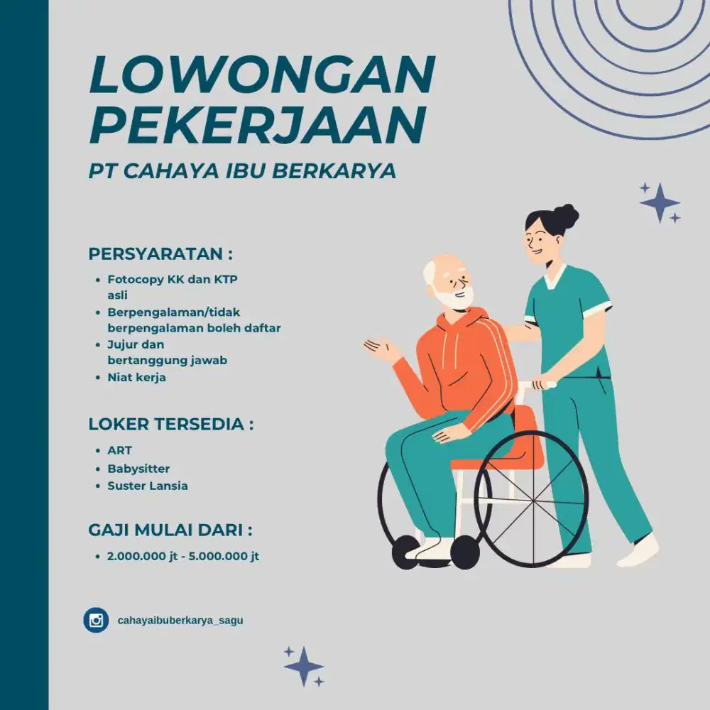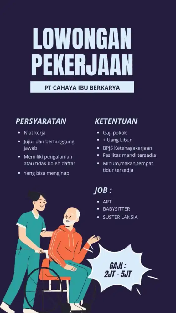 Dibuka loker art, baby sitter, perawat lansia Syarat : KTP Asli Foto kopi kartu keluarga Surat izin Usia 18 - 45 tahun Mess gratis Makan minum gratis WiFi gratis Pelatihan gratis Wajib menginap Gaji : 2,3 jt - 4jt Yg serius kerja aja! Silahkan wa ke nmr wa nol delapan tiga belas lima belas delapan dua 446