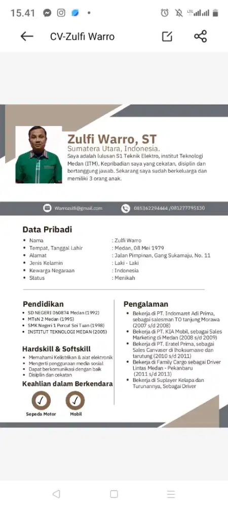 Selamat Pagi, Bapak/ibu perusahan PT/CV/BUMN/SWASTA/Pribadi. Nama Saya ZULFI WARRO. ST. Saya Mencari pekerjaan supir/Driver : kantor, PT, CV, BUMN/Swasta atau Pribadi. atau SALESMAN TO. Saya siap Utk perjalan ke luar kota, kemana aja yg penting ada tujuannya, dan ada gaji pokok dan fasilitas yg lain nya, saya siap melengkapi berkas berkas yg di minta,termasuk surat medical check up, dn tes urin, saya Tdk merokok,dn saya siap Utk teken kontrak, di sini saya lampirkan berkas berkas saya antara lain : 1. Pas photo. 2. Photo SIM C/B1. 3. Photo KTP. 4. Photo SKCK. 5. Photo Surat Pengalaman kerja sy, sebagai Driver atau salesman To. 6. photo Ijazah SMK dn S1. 7. Saya siap Utk teken kontrak Pekerjaan yg di minta perusahan PT/CV BUMN/Swasta dn Pribadi. 8. Saya udah Nikah. 9. Saya Muslim. 10. DLL. Terimakasih untuk OLX. Semoga, bapak/ibu perusahan PT,CV,BUMN, SWASTA dn PRIBADI, dapat menerima saya. Mohon Maaf saya kalau ada kata kata saya yg kurang berkenan di hati Bapak/Ibu, Saya ucapkan Terima kasih. # S E L A M A T P A G I #