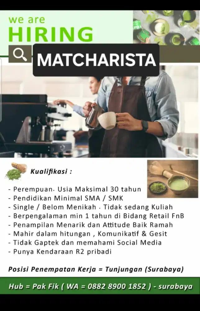Pekerjaan Tersedia Lowker wanita Pembuat Minuman. Matcharsita / barista / waiters. Lowker – Cocok untuk Pemula