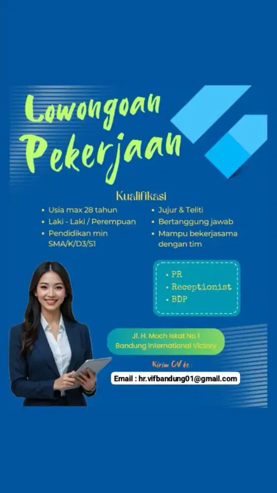Loker Kota Bandung 1. Reseptionist 2. General Admin 3. Business Development 4. Business Officer 5. Assistant Manager Kualifikasi : 1. Min pendidikan SMA, D3/S1 diutamakan 2. Pria/Wanita 3. Min. Usia 21 tahun 4. Mau belajar 5. Money oriented 6. Rajin, disiplin, dan rapi Segera hub nomor ini / kirim lamaran dan CV ke email
