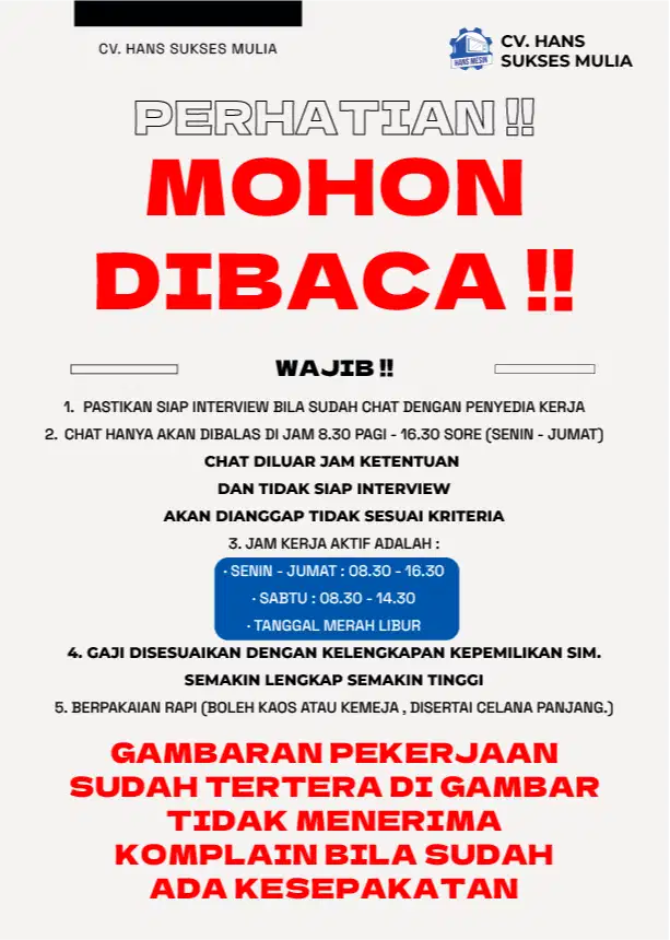 Dibuka Loker / Dicari / Dibutuhkan SERABUTAN / STAF GUDANG / SOPIR TAHAP PERTAMA SUPAYA DITERIMA ADALAH : 1. MOHON BUDAYAKAN MEMBACA 2. PUNYA KESADARAN BER-INISIATIF YANG BAIK 3. PASTIKAN MENGIRIMKAN BERKAS LENGKAP SESUAI KETENTUAN DAN SUDAH SIAP UNTUK INTERVIEW 4. CHAT WA HANYA BISA DI SENIN - JUMAT : 08.30 - 16.30 , DILUAR JAM TERSEBUT DIANGGAP TIDAK SESUAI KRITERIA (Kosong Delapan Satu Dua - Satu Tujuh Tujuh Dua - Enam Kosong Sembilan Lima) GAMBARAN PEKERJAAN dan Jobdesk sesuai gambar *CHAT DI OLX BELUM TENTU DIBALAS, SEGERA HUBUNGI WA BILA BERSUNGGU-SUNGGU DAN SIAP DI-INTERVIEW * Tidak Menerima orang yang tidak berinisiatif dan tidak cekatan. Tempat Interview : (Sesuai kesepakatan saat chat di WA) 1. JL. BONGKARAN NO 20, BONGKARAN, KEC. PABEAN CANTIKAN, SURABAYA, JAWA TIMUR 60161 2. JL. KEMBANG JEPUN NO. 35 , BONGKARAN, KEC. PABEAN CANTIAN , KOTA SBY, JAWA TIMUR . 60161