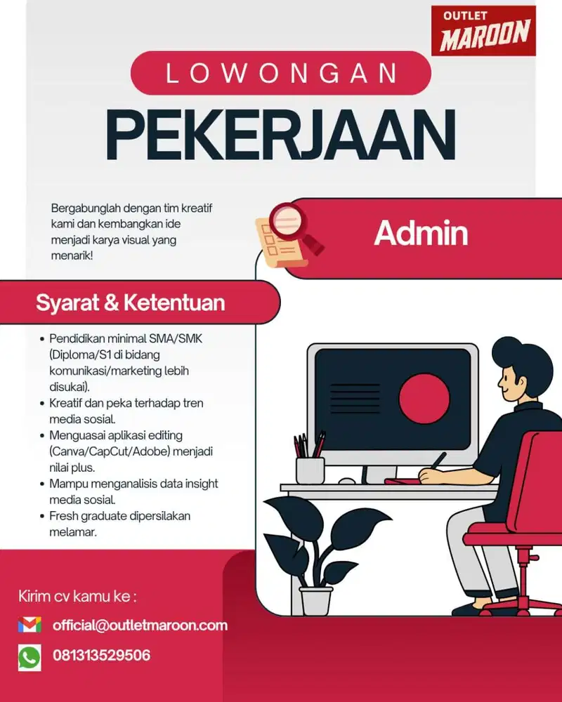 Kualifikasi: -Pendidikan minimal SMA/SMK (Diploma/S1 di bidang komunikasi/marketing lebih disukai). -Kreatif dan peka terhadap tren media sosial. -Menguasai aplikasi editing (Canva/CapCut/Adobe) menjadi nilai plus. -Mampu menganalisis data insight media sosial. -Fresh graduate dipersilakan melamar. -Bersedia bekerja full-time dan loyal terhadap pekerjaan nilai + -kirim kan cv ke (+6281313529506)