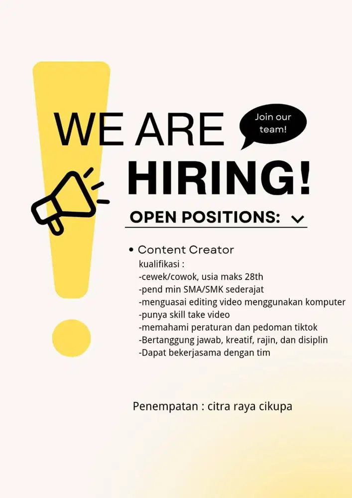 ‼ INFO LOKER ‼ DIBUTUHKAN SEGERA CONTENT CREATOR Kualifikasi : -cewek/cowok, usia maks 28 th -pend min SMA/SMK sederajat -menguasai editing video menggunakan komputer -punya skill take video -memahami peraturan dan pedoman tiktok -bertanggung jawab, kreatif, rajin, dan disiplin -dapat bekerjasama dengan tim Penempatan : Citra Raya Cikupa Benefit : Gaji Pokok, Uang Kerajinan, Uang Lembur