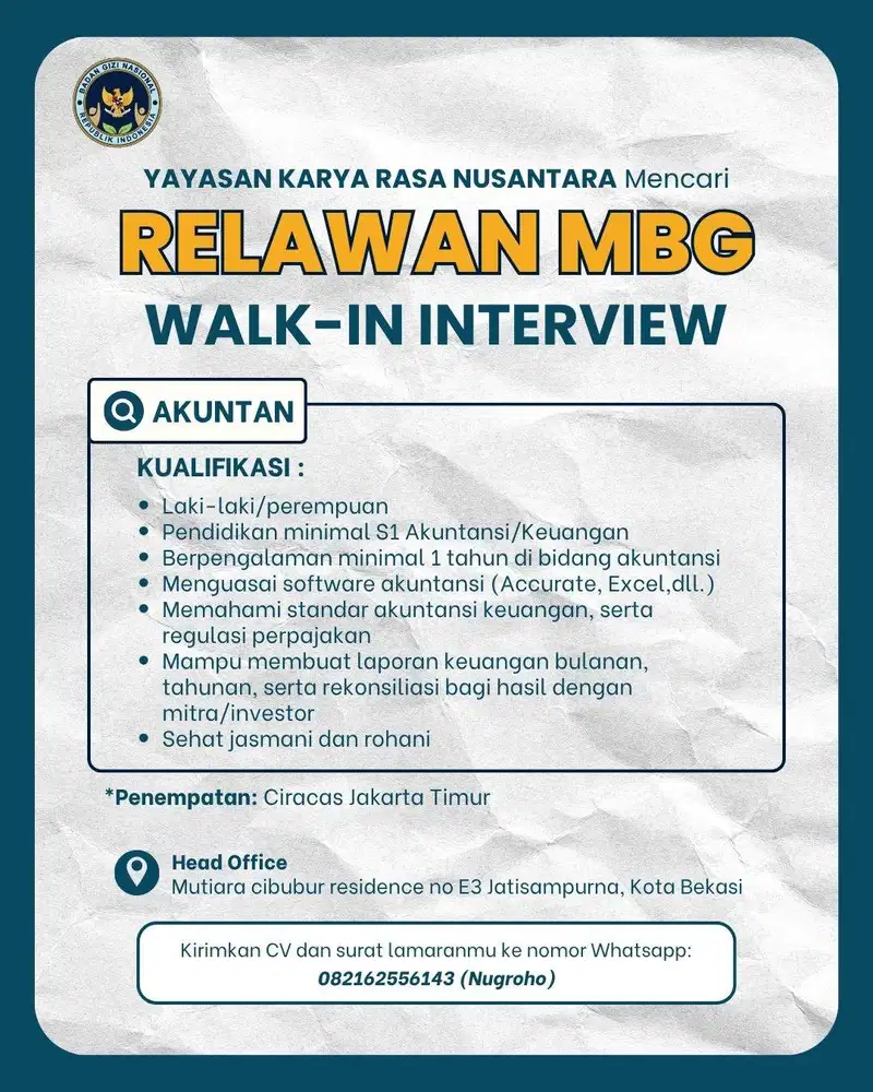 Kami membuka kesempatan untuk bergabung sebagai Relawan MBG di beberapa posisi: 1. Kepala Dapur 2. Kepala SPPG 3. Ahli Gizi 4. Pengolahan Bahan Makanan 5. Pengawas Pemeliharaan dan Pengantaran 6. Akuntan 7. Pemorsian 8. Packing 9. Distribusi 10. Petugas Kebersihan 11. Pencuci Alat Makan 12. Persiapan Bahan Makanan Bagi yang berminat, langsung kirim CV