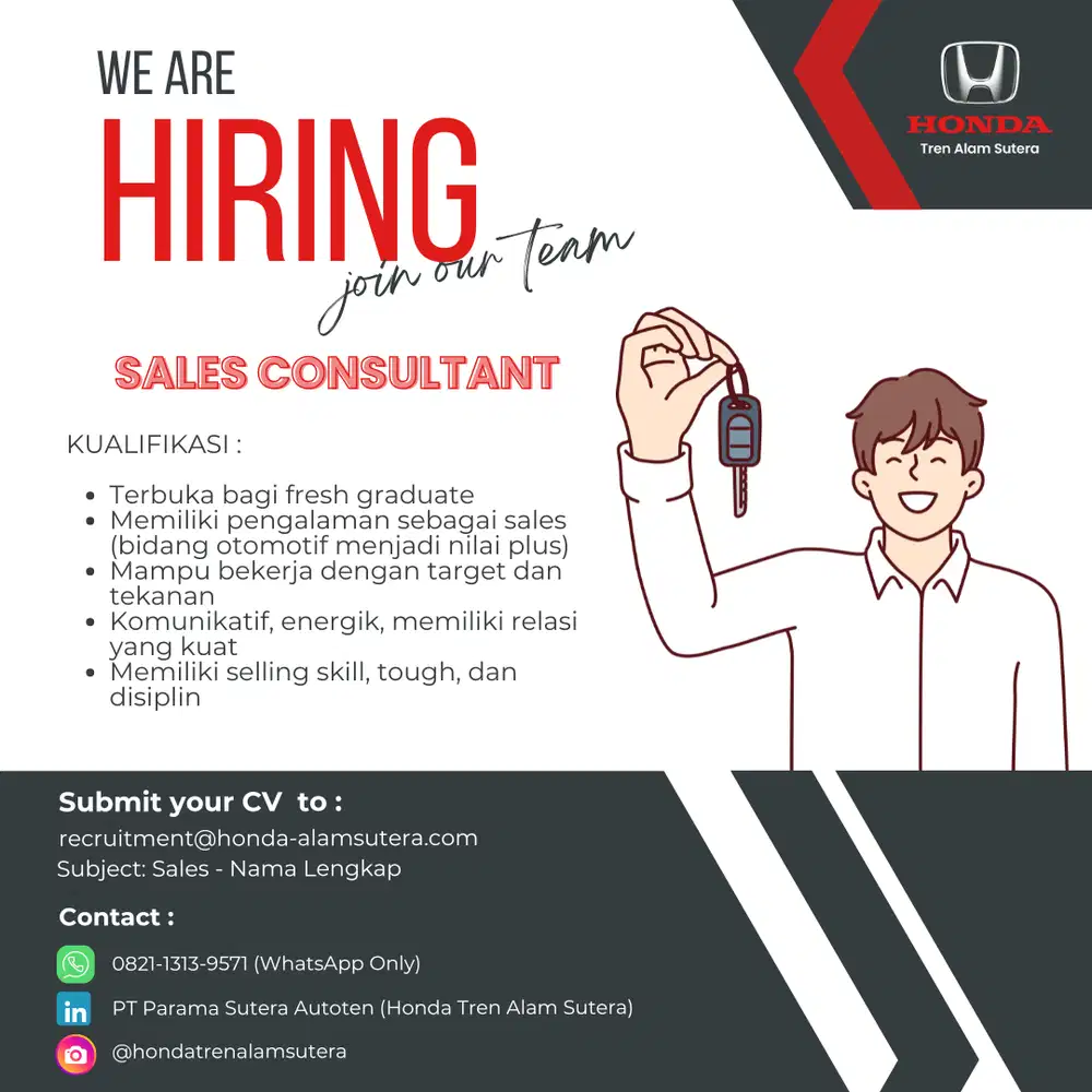 KUALIFIKASI : - Terbuka bagi fresh graduate - Diutamakan memiliki pengalaman sebagai sales (bidang otomotif menjadi nilai plus) - Mampu bekerja dengan target dan tekanan - Komunikatif, energik, memiliki relasi yang kuat - Memiliki selling skill, tough, dan disiplin Penempatan di Honda Tren Alam Sutera, Tangerang Silahkan kirim cv ke chat atau bs hubungi ke 0 delapan dua 1 1 tiga 1 tiga 9 lima tujuh 1