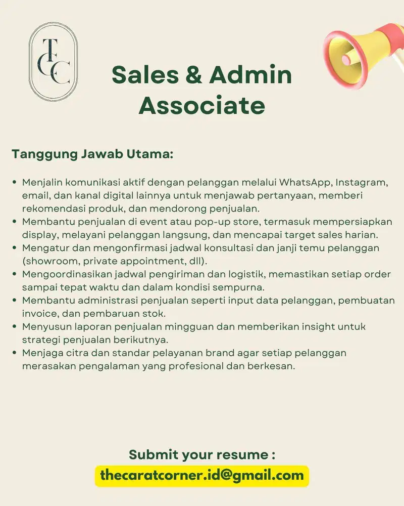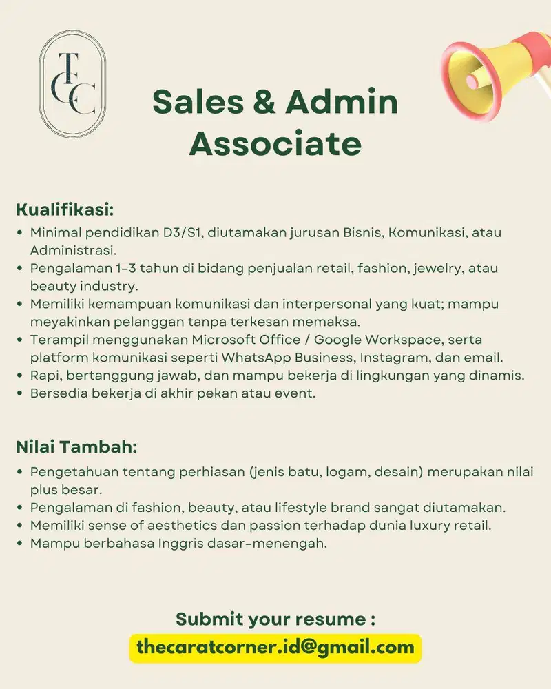 Sales & Admin Associate Produk Perhiasan Kami mencari Sales & Admin Associate yang berorientasi pada detail, komunikatif, dan memiliki kemampuan multitasking tinggi untuk mendukung kegiatan penjualan dan operasional harian. Posisi ini akan menjadi penghubung utama antara perusahaan dan pelanggan—baik secara online maupun offline—serta memastikan semua proses penjualan, penjadwalan, dan logistik berjalan lancar. WFO dari Kebon Jeruk, Jakarta Barat Pengalaman di perusahaan perhiasan diutamakan