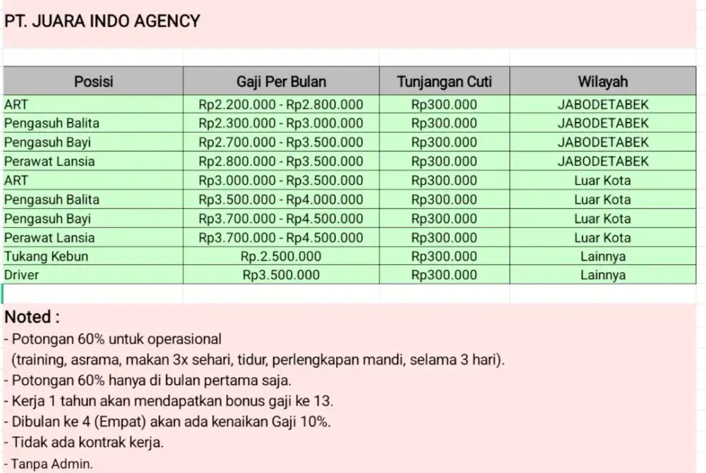 - pendaftaran gratis - dibulan ke 4 ada kenaikan gaji 10% - kerja 1 tahun akan mendapatkan gaji ke 13 - tidak ada kontrak kerja. Persyaratan e-KTP, KK dan surat izin orang tua/suami aja.. #yayasan resmi