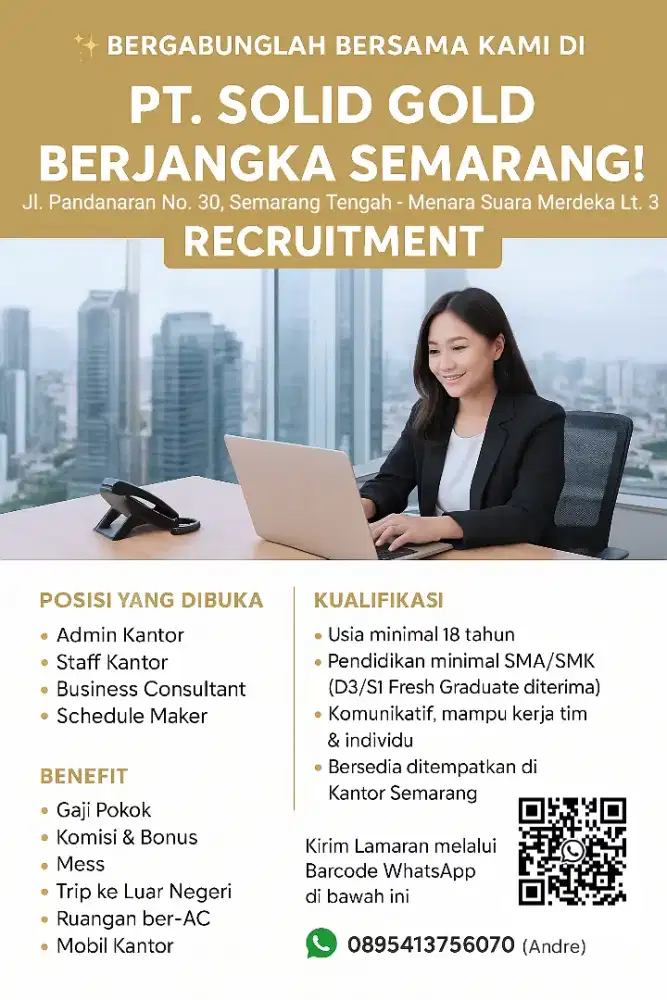 PT Solid Gold Berjangka Semarang Di Cari secepatnya - Schedule Maker - Administrasi - Bussiness Consultant - Staff Kantor Dengan syarat - Umur minimal 18 Tahun - Minimal pendidikan SMA/SMK/Sederajat (Menerima Fresh Graduate/Non Pengalaman) - Mampu Bekerjasama dengan team ataupun individu - Mampu Berkomunikasi dengan baik - Bersedia di tempatkan di kantor Semarang Sistem Penghasilan : - Gaji Pokok - Komisi - Hadiah - Reward/Minggu Lokasi Kantor di Tower Suara Merdeka Lt.3 Jl. Pandanaran No.30, Semarang Tengah, Kota Semarang Kirim CV Ke Nomor WA Saya O895 4I37 56O7O